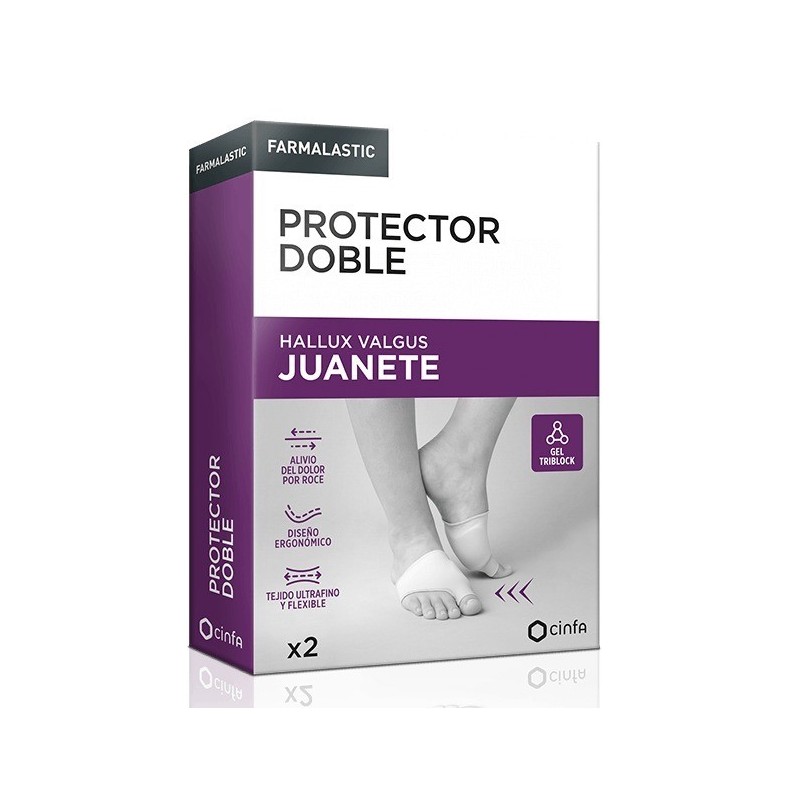 El Protector Doble, para adultos, está indicado para personas que tienen juanetes incipientes o personas con juanetes avanzados y que ya no pueden mover el primer dedo del pie. Ayuda a aliviar el dolor de juanete provocado por el roce del calzado. Ayuda a reducir la presión y la fricción excesiva sobre el juanete. Ayuda a aliviar los dolores plantares y la sensación de recalentamiento. Evita la formación de durezas y callosidades. El Protector Doble de Gel Triblock está recubierto por un agradable tejido ultrafino y flexible que le aporta elasticidad para adaptarse al pie. Diseño ergonómico que facilita su colocación. El gel es multidireccional, suave y flexible, eliminando la fricción al caminar. Cuenta con memoria de recuperación, vuelve a su forma inicial tras su uso. Se puede reutilizar. Apto para utilizar con calcetines, medias y calzado habitual.